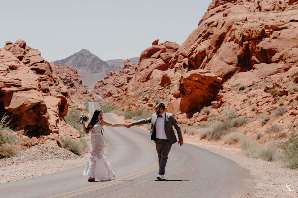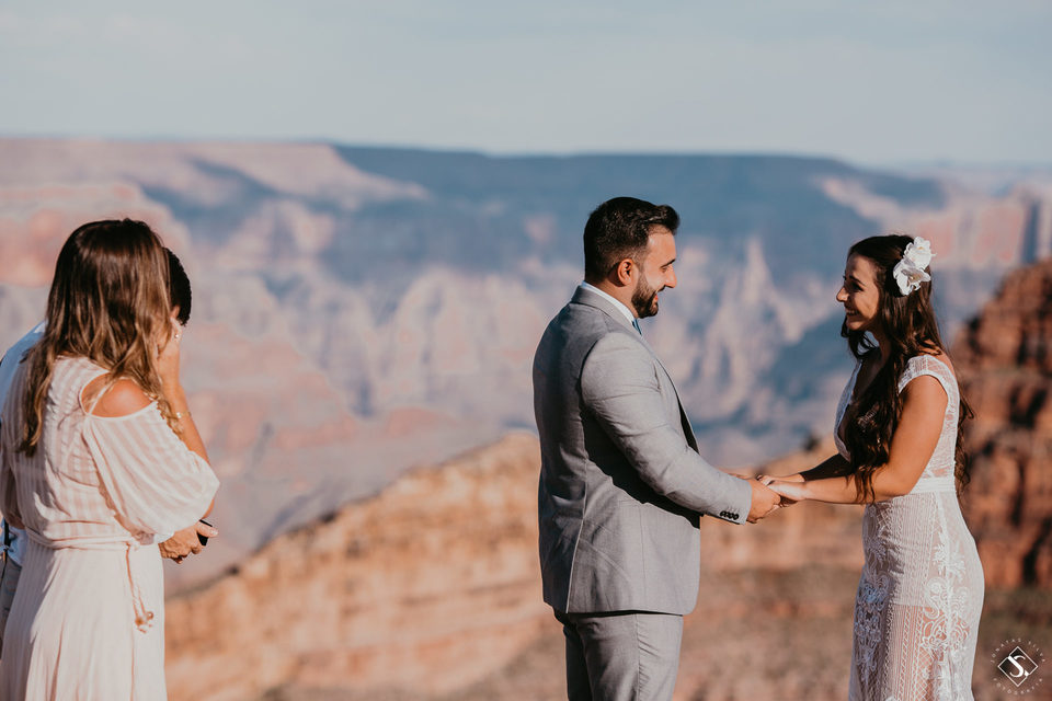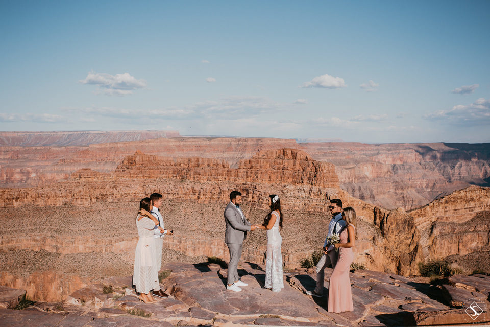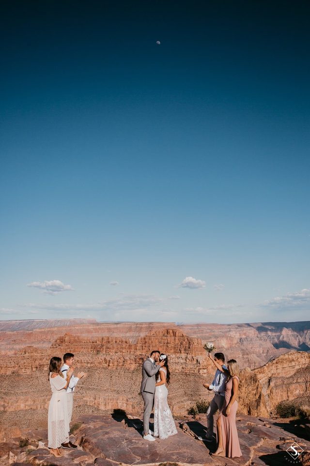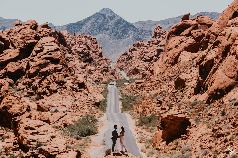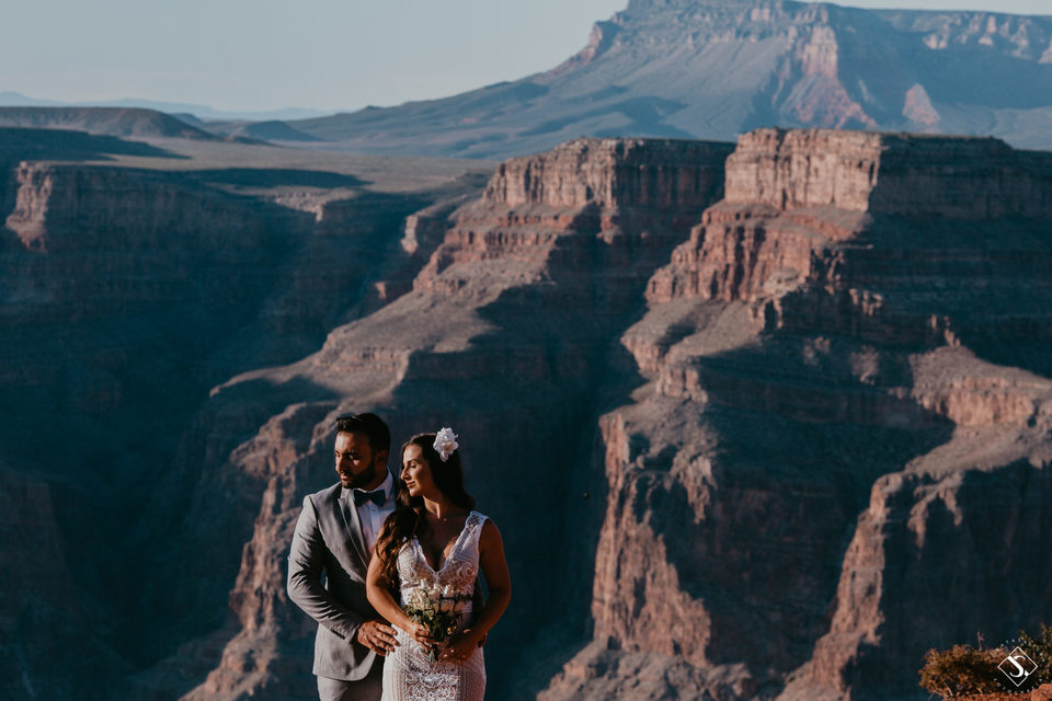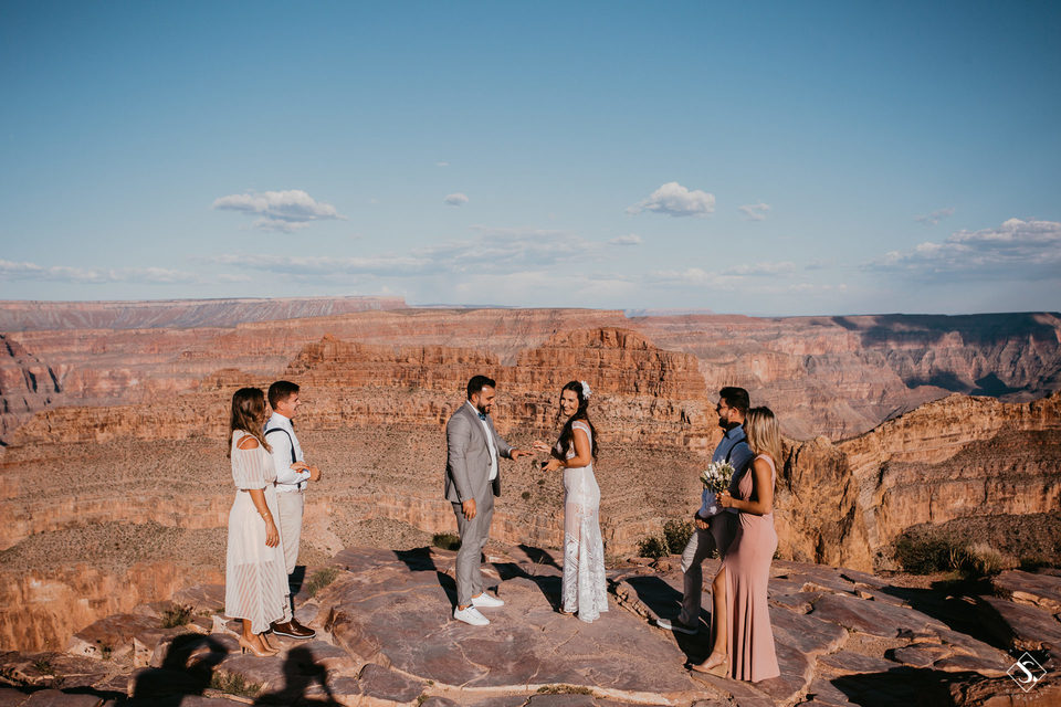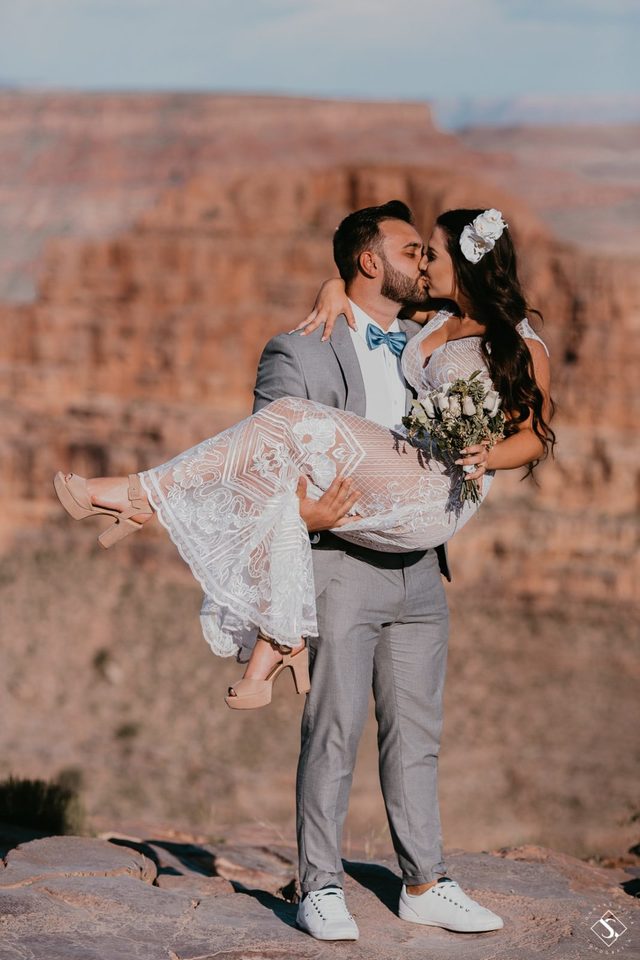 Um dos casamentos mais incríveis que fizemos, aconteceu como os casamentos de filmes, e foi um casamento no Grand Canyon! Quando o Neto e a Bruna nos procuraram, a ideia inicial, era casar em uma das capelas em Las Vegas, e a medida que íamos trocando mensagens, encontrávamos empecilhos que faziam essa ideia não ir para frente, e hoje sabemos que era por um motivo maior, para que pudéssemos realizar esse casamento em um lugar mágico e com um visual de tirar o fôlego!! E assim aconteceu, fomos para Las Vegas nos encontrar com eles, e ficamos no hotel Stratosphere, onde a torre tem uma das vistas mais bonitas, no top of the world, onde aconteceu o first look do casal, já que o casamento seria realizado a alguns km de distancia, eles precisavam desse primeiro contato especial e registrado! Depois da emoção de ver a noiva pronta, fomos rumo ao lugar onde seria feita a cerimonia do casamento, parando apenas no caminho para fazer fotos no Valley of Fire! E chegando lá, que espetáculo de lugar, na imensidão dos Canyons em Las Vegas eles trocaram os votos, as alianças, e deram o primeiro beijo como recém casados, foi lindo de ver e viver! E não acabou por ai, teve parada no Mc Donald’s para o jantar de casamento, e em seguida a festa foi uma balada na Limusine, com direito a parada na placa de Las Vegas e para finalizar com chave de ouro, hora do cassino!