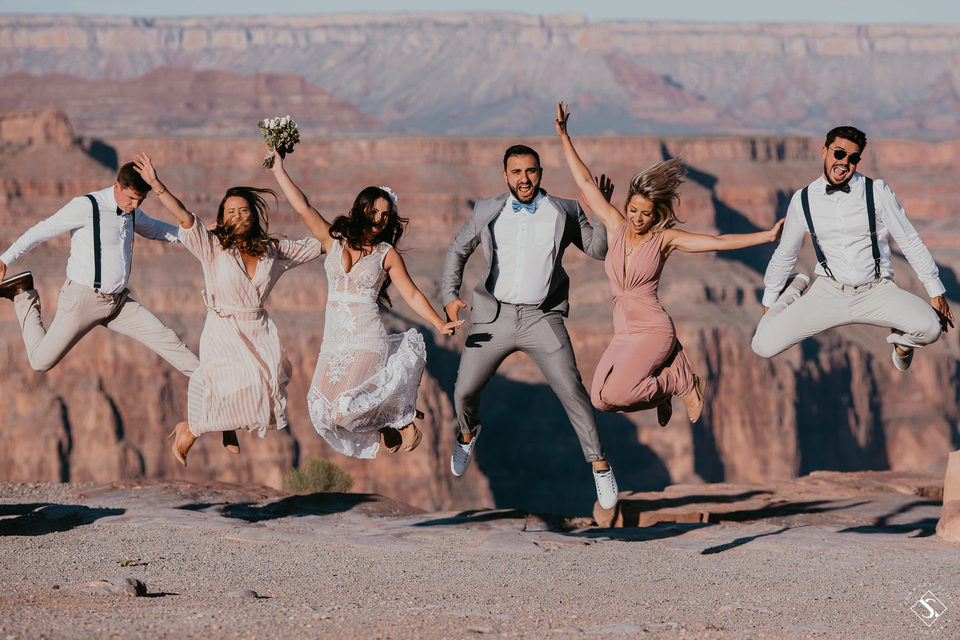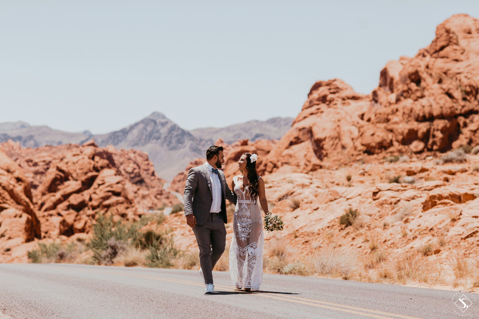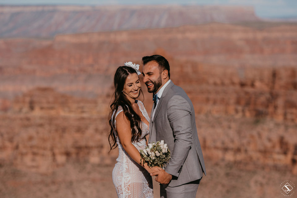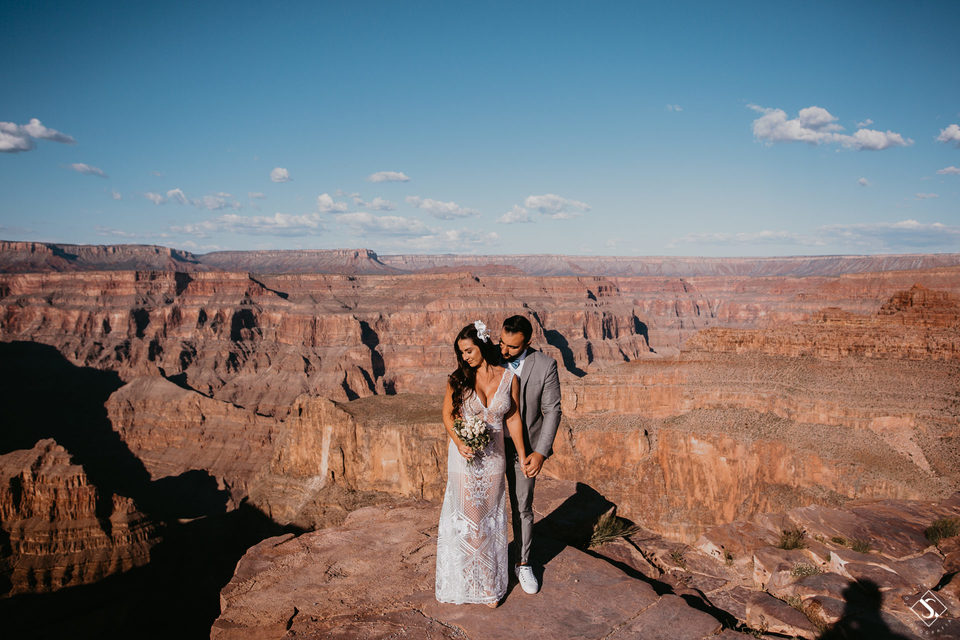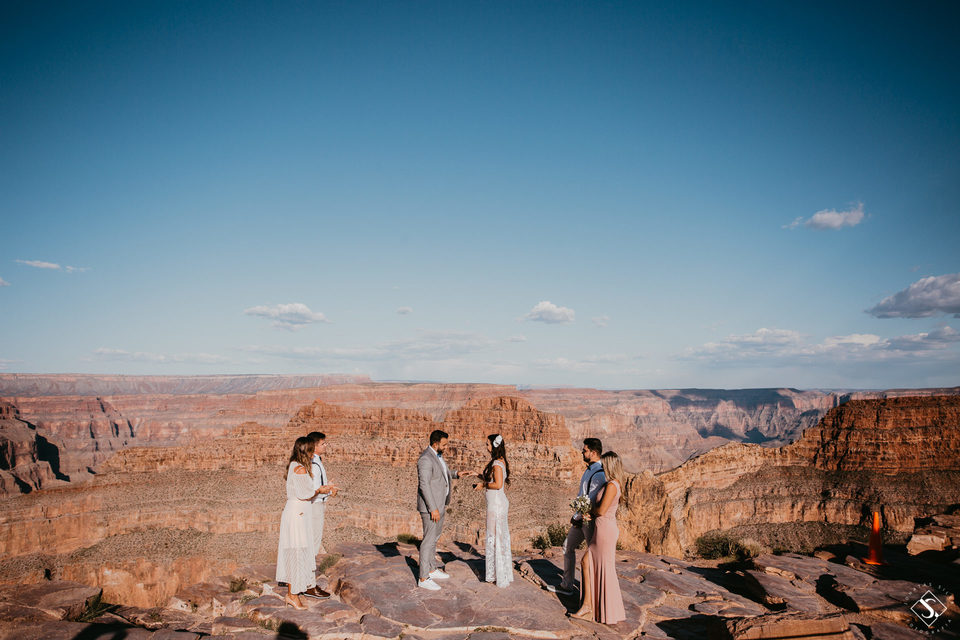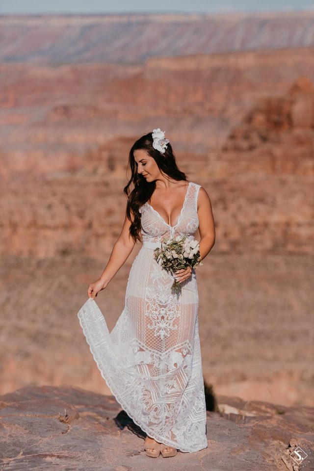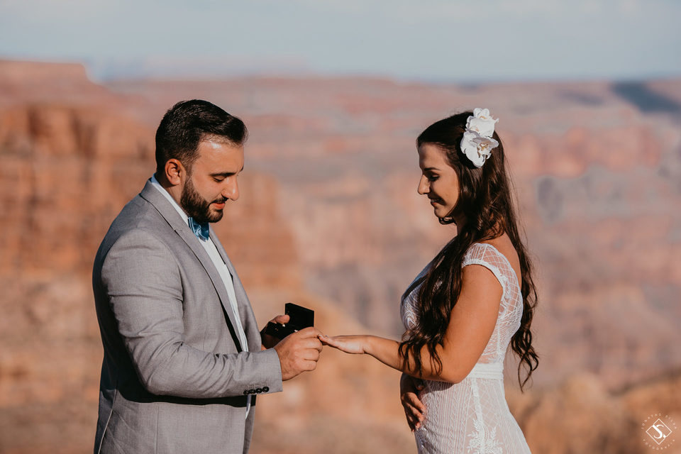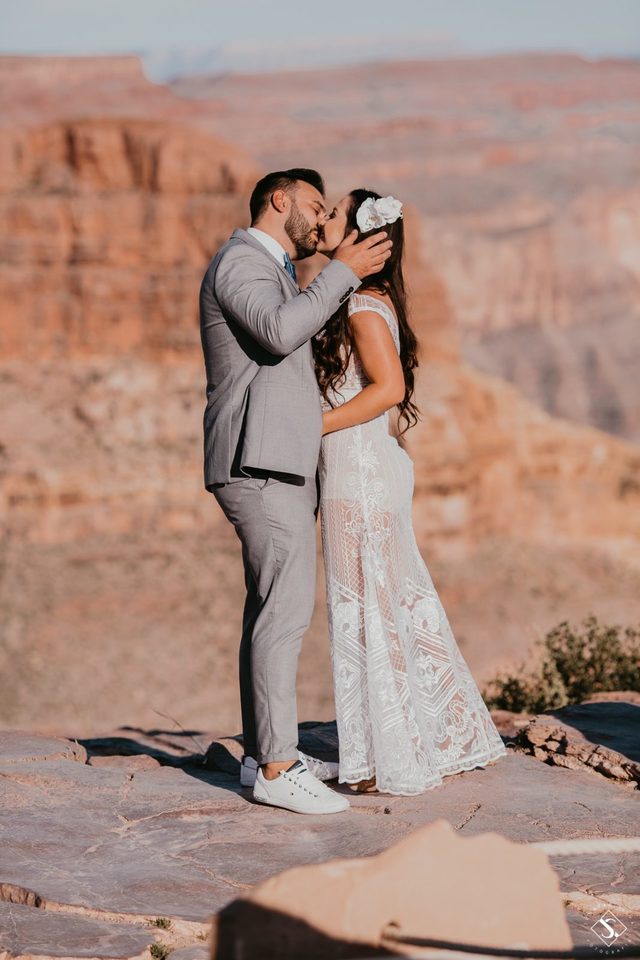 Um dos casamentos mais incríveis que fizemos, aconteceu como os casamentos de filmes, e foi um casamento no Grand Canyon! Quando o Neto e a Bruna nos procuraram, a ideia inicial, era casar em uma das capelas em Las Vegas, e a medida que íamos trocando mensagens, encontrávamos empecilhos que faziam essa ideia não ir para frente, e hoje sabemos que era por um motivo maior, para que pudéssemos realizar esse casamento em um lugar mágico e com um visual de tirar o fôlego!! E assim aconteceu, fomos para Las Vegas nos encontrar com eles, e ficamos no hotel Stratosphere, onde a torre tem uma das vistas mais bonitas, no top of the world, onde aconteceu o first look do casal, já que o casamento seria realizado a alguns km de distancia, eles precisavam desse primeiro contato especial e registrado! Depois da emoção de ver a noiva pronta, fomos rumo ao lugar onde seria feita a cerimonia do casamento, parando apenas no caminho para fazer fotos no Valley of Fire! E chegando lá, que espetáculo de lugar, na imensidão dos Canyons em Las Vegas eles trocaram os votos, as alianças, e deram o primeiro beijo como recém casados, foi lindo de ver e viver! E não acabou por ai, teve parada no Mc Donald’s para o jantar de casamento, e em seguida a festa foi uma balada na Limusine, com direito a parada na placa de Las Vegas e para finalizar com chave de ouro, hora do cassino!