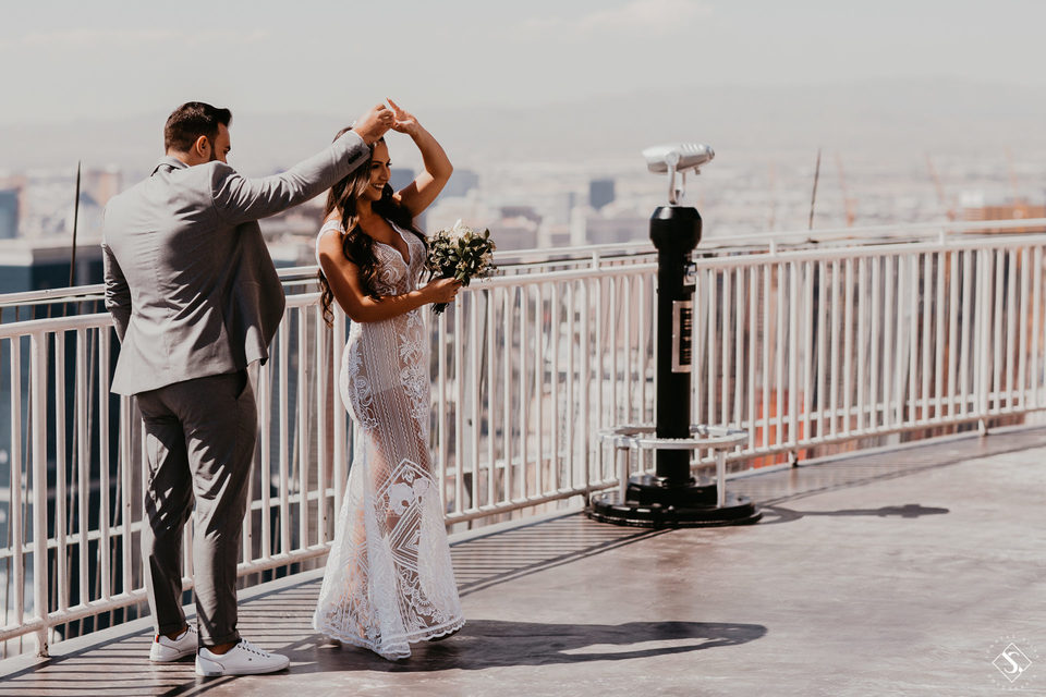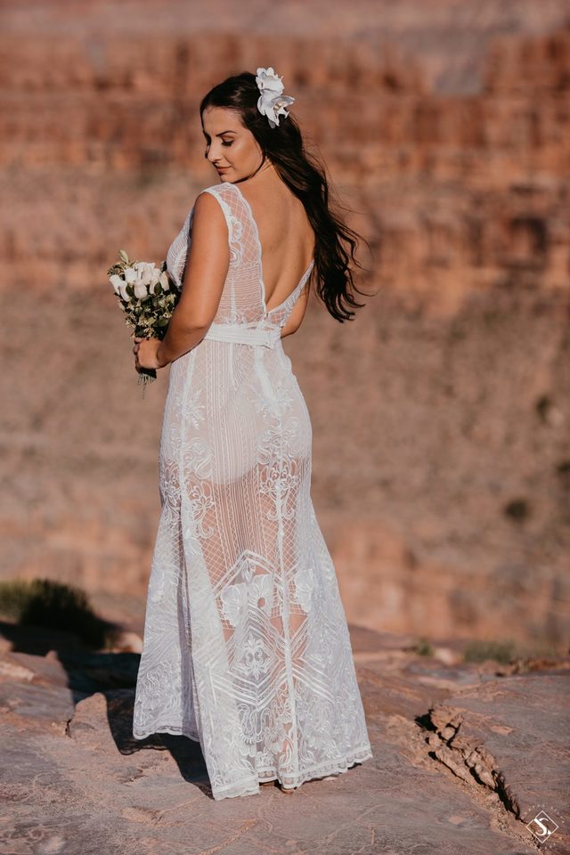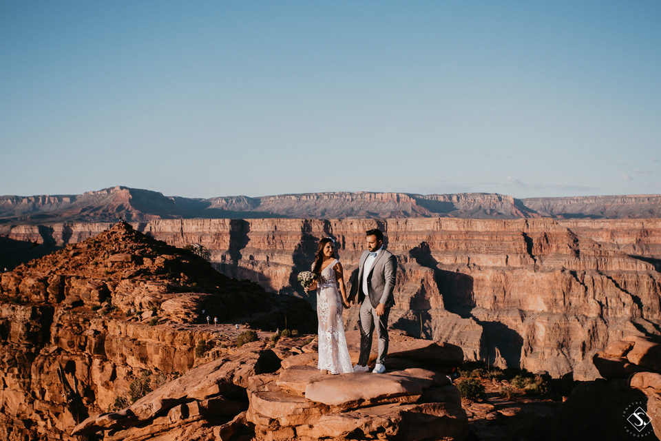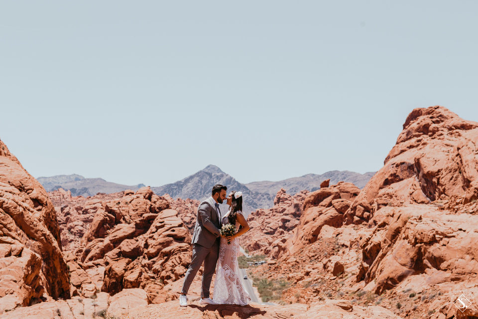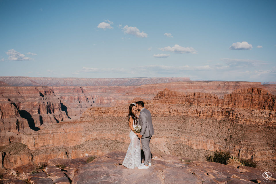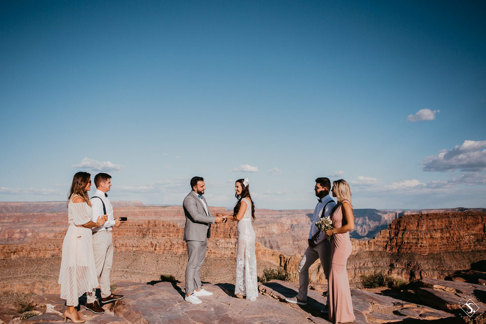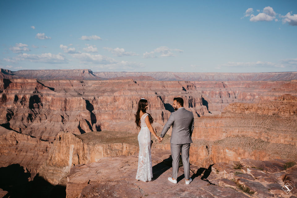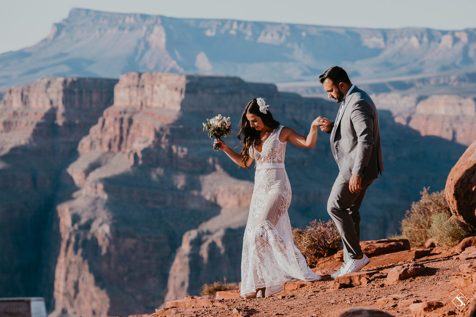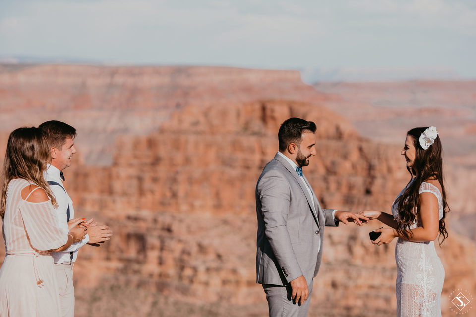 Um dos casamentos mais incríveis que fizemos, aconteceu como os casamentos de filmes, e foi um casamento no Grand Canyon! Quando o Neto e a Bruna nos procuraram, a ideia inicial, era casar em uma das capelas em Las Vegas, e a medida que íamos trocando mensagens, encontrávamos empecilhos que faziam essa ideia não ir para frente, e hoje sabemos que era por um motivo maior, para que pudéssemos realizar esse casamento em um lugar mágico e com um visual de tirar o fôlego!! E assim aconteceu, fomos para Las Vegas nos encontrar com eles, e ficamos no hotel Stratosphere, onde a torre tem uma das vistas mais bonitas, no top of the world, onde aconteceu o first look do casal, já que o casamento seria realizado a alguns km de distancia, eles precisavam desse primeiro contato especial e registrado! Depois da emoção de ver a noiva pronta, fomos rumo ao lugar onde seria feita a cerimonia do casamento, parando apenas no caminho para fazer fotos no Valley of Fire! E chegando lá, que espetáculo de lugar, na imensidão dos Canyons em Las Vegas eles trocaram os votos, as alianças, e deram o primeiro beijo como recém casados, foi lindo de ver e viver! E não acabou por ai, teve parada no Mc Donald’s para o jantar de casamento, e em seguida a festa foi uma balada na Limusine, com direito a parada na placa de Las Vegas e para finalizar com chave de ouro, hora do cassino!