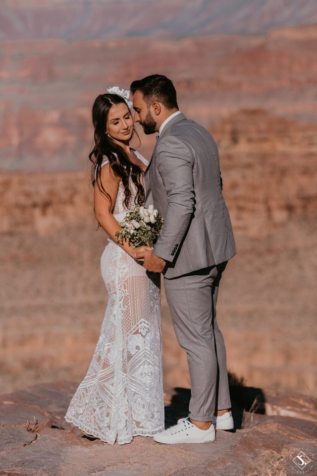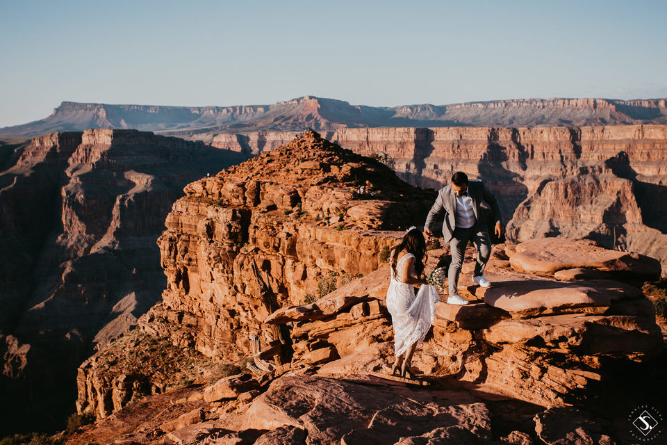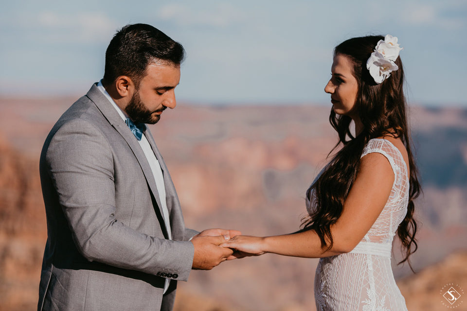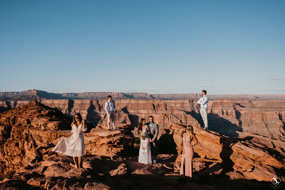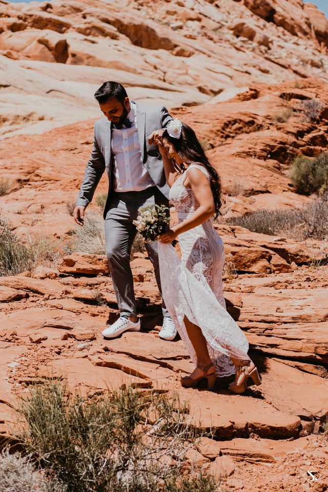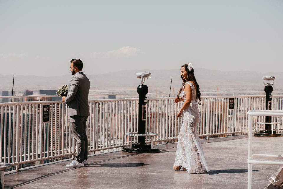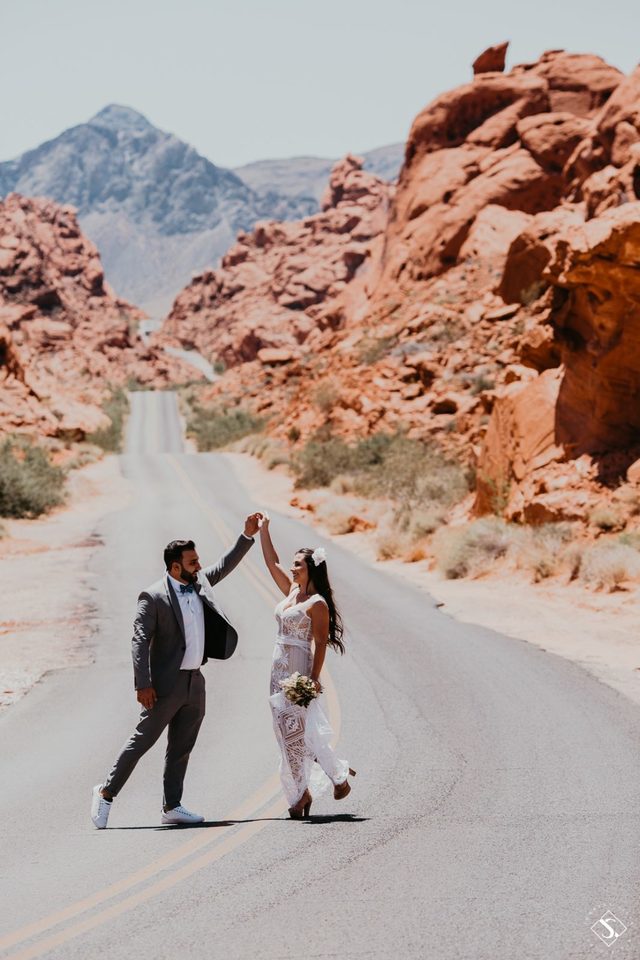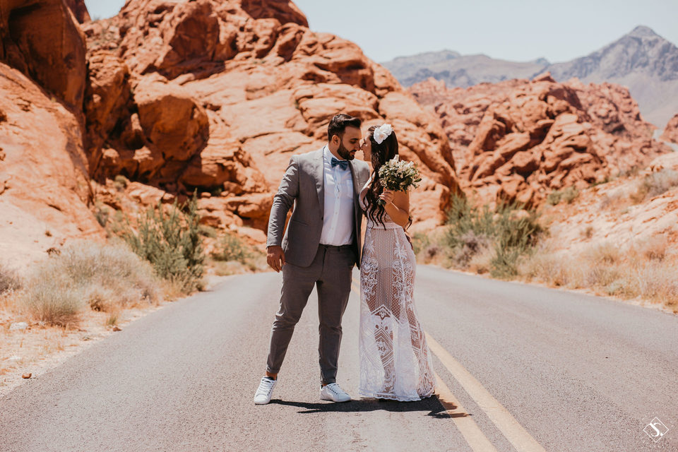 Um dos casamentos mais incríveis que fizemos, aconteceu como os casamentos de filmes, e foi um casamento no Grand Canyon! Quando o Neto e a Bruna nos procuraram, a ideia inicial, era casar em uma das capelas em Las Vegas, e a medida que íamos trocando mensagens, encontrávamos empecilhos que faziam essa ideia não ir para frente, e hoje sabemos que era por um motivo maior, para que pudéssemos realizar esse casamento em um lugar mágico e com um visual de tirar o fôlego!! E assim aconteceu, fomos para Las Vegas nos encontrar com eles, e ficamos no hotel Stratosphere, onde a torre tem uma das vistas mais bonitas, no top of the world, onde aconteceu o first look do casal, já que o casamento seria realizado a alguns km de distancia, eles precisavam desse primeiro contato especial e registrado! Depois da emoção de ver a noiva pronta, fomos rumo ao lugar onde seria feita a cerimonia do casamento, parando apenas no caminho para fazer fotos no Valley of Fire! E chegando lá, que espetáculo de lugar, na imensidão dos Canyons em Las Vegas eles trocaram os votos, as alianças, e deram o primeiro beijo como recém casados, foi lindo de ver e viver! E não acabou por ai, teve parada no Mc Donald’s para o jantar de casamento, e em seguida a festa foi uma balada na Limusine, com direito a parada na placa de Las Vegas e para finalizar com chave de ouro, hora do cassino!